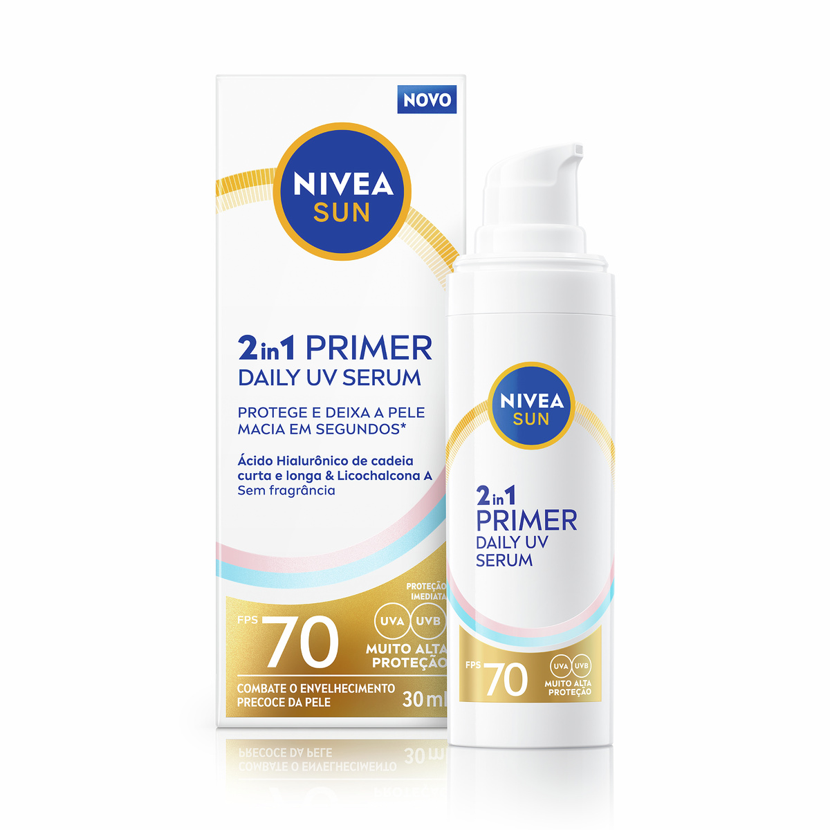 Ideal para quem ama maquiagem e não abre mão de uma pele bem cuidada, o novo NIVEA SUN 2 em 1 Primer une FPS70 a uma fórmula inteligente com dois tipos de ácido hialurônico — de cadeia longa, que hidrata as camadas superficiais, e de cadeia curta, que alcança as camadas mais profundas e estimula a produção natural dessa molécula. A composição conta ainda com Licochalcona A, um poderoso antioxidante que protege contra os radicais livres gerados pela radiação UV e reforça os mecanismos naturais de defesa da pele contra o estresse oxidativo.