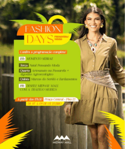 A moda vai tomar conta da Praça Central do Midway Mall a partir desta terça-feira (07), com o início de mais uma edição do Fashion Days, um dos eventos mais esperados do calendário da moda potiguar. Entre os dias 07 e 09 de outubro, o shopping promove desfiles diários com as principais tendências da temporada primavera/verão 2025, além de uma programação especial com música, interações e projetos de valorização da moda local.