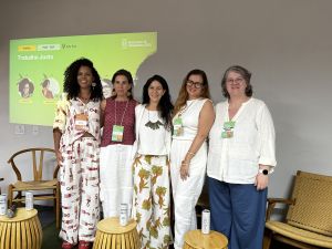 “Foram dias de muita troca, networking e conhecimento de projetos e experiências incríveis em diversos países. Participar do evento nos trouxe mais perspectiva em poder fortalecer as boas práticas que desenvolvemos em Ibiúna, no bairro de Verava”, comenta Gabriela, que participou como convidada do painel “Trabalho Justo”. No debate compartilhou as práticas de gestão humanizada desenvolvidas no hotel, ao lado de representantes de outras instituições como Renata Fabrini, co-fundadora da Plonge, Cecilia Peluso, CEO da Limpiolux (Argentina), Irina Bacci, da Fundação Panamericana de Desenvolvimento, e Priscilla Konce, do Sistema B Brasil. Durante o encontro, os representantes de Morros Verdes visitaram a Ilha de Cotijuba, onde conheceram a produção de látex natural e o trabalho do Instituto Tribu, que transforma a matéria-prima em artigos de moda com forte impacto social e geração de renda local.