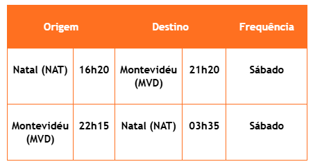 As novas operações da rota Natal-Montevidéu estão divididas em três períodos durante o próximo ano, permitindo tanto aos Clientes do Rio Grande do Norte e demais estados do Nordeste, quanto aos uruguaios, se programarem com antecedência para viajar com tranquilidade: de 21 de março a 4 de abril; de 25 de junho a 1º de agosto; e a partir de 5 de dezembro de 2026.