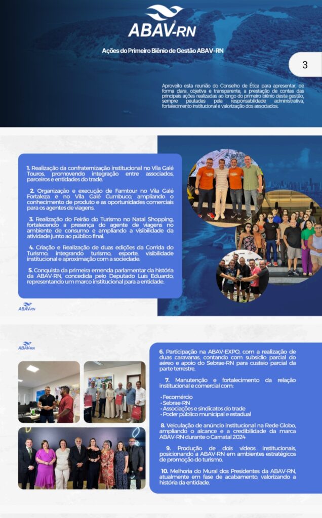 O presidente da Abav-RN, Antônio Neto, apresentou na reunião do Conselho de Ética da entidade, a prestação de contas das principais ações realizadas ao longo do 1° Biênio de sua gestão.