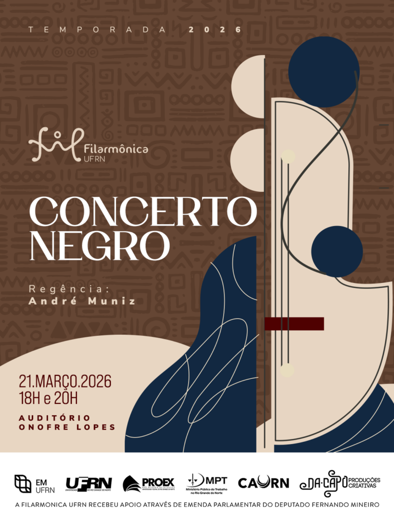 Neste sábado, o palco se torna memória e resistência com o “Concerto Negro” da Filarmônica UFRNA Filarmônica UFRN inicia sua temporada artística de 2026 neste sábado, 21 de março, com o Concerto Negro, uma apresentação que celebra a força criativa das matrizes afro na música de concerto. O público poderá assistir gratuitamente em duas sessões, às 18h e 20h, no Auditório Onofre Lopes, na Escola de Música da UFRN, sob regência do maestro André Muniz.Com um programa que atravessa épocas e territórios, o concerto evidencia a presença afro-atlântica na construção da música sinfônica. A abertura traz Danse Nègre, de Samuel Coleridge-Taylor, seguida pela Sinfonia em Sol Maior, Op. 11, de Joseph Bologne, Chevalier de Saint-Georges. Na sequência, o público escuta o Largo da Sinfonia nº 9 “Do Novo Mundo”, de Antonín Dvořák.Na segunda parte, o repertório se volta ao Brasil, com Batuque, de Oscar Lorenzo Fernández, e culmina na Suíte Nação Zumbi, em arranjo de “Kidbone”, que aproxima a linguagem sinfônica do universo do manguebeat.Mais do que um concerto, a proposta reafirma a música de concerto como espaço de memória, identidade e diálogo com o presente, destacando contribuições historicamente invisibilizadas.Fundada em 2009, a Filarmônica UFRN reúne estudantes dos cursos Técnico, Licenciatura, Bacharelado e Pós-Graduação em Música da universidade. Ao longo de sua trajetória, consolidou-se como um importante espaço de formação artística e de difusão da música de concerto no Nordeste, aproximando repertórios clássicos, contemporâneos e brasileiros do público.A realização da Temporada 2026 é da Filarmônica UFRN, EMUFRN, UFRN e PROEX, com patrocínio Caixa Assistencial Universitária do RN – CAURN e do Ministério Público do Trabalho no Rio Grande do Norte- MPT/RN e produção da Da Capo Produções Artísticas. A Filarmônica recebeu apoio através de emenda parlamentar do deputado Fernando Mineiro. Ingressos