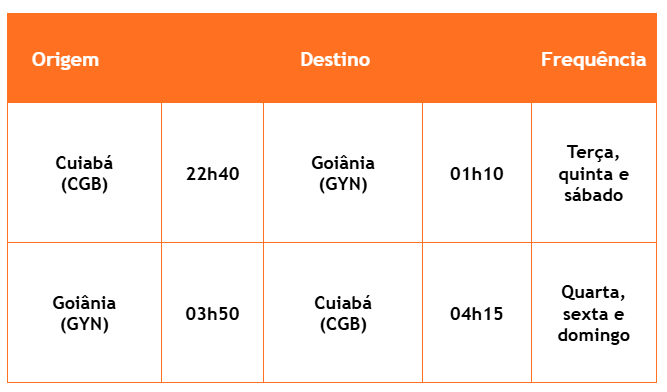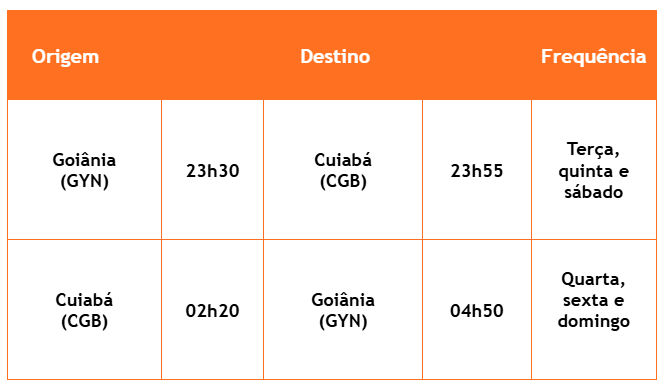 Entre 30 de abril e 17 de junho, as 3 frequências semanais a partir de Goiânia acontecerão às terças, quintas e sábados, e a volta de Cuiabá, às quartas, sextas e domingos. Os dias e horários terão sutil mudança a partir de 19 de junho, quando as decolagens em Cuiabá passarão a ser às terças, quintas e sábados, e em Goiânia, às quartas, sextas e domingos. [Veja tabelas de frequências e horários, abaixo].