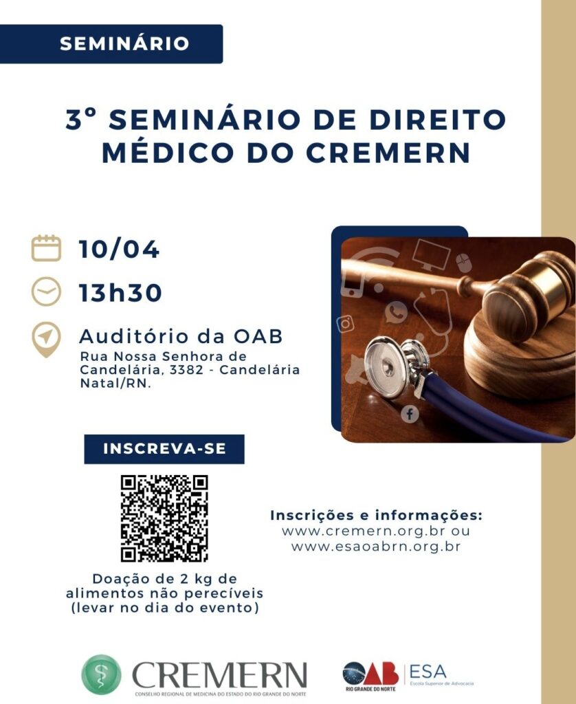 Com a medicina e o direito em constante transformação pela tecnologia, o Rio Grande do Norte se prepara para receber, já na próxima sexta-feira (10), o 3º Seminário de Direito Médico do CREMERN. O evento, realizado em parceria com a OAB/RN, reunirá autoridades nacionais no Auditório da OAB/RN, em Candelária, das 13h30 às 18h.